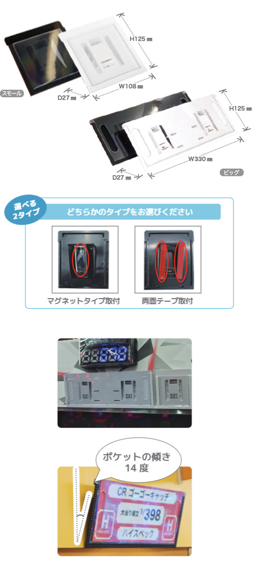 スペックホルダー CA011 幕板装飾のPOP・機種ゲーム説明スペック収納アイテム スペックを見やすくスッキリと ラミネート不要のスタイリッシュな告知を サイズ2タイプに加え 裏面取付け仕様が両面テープ マグネットの 2タイプがございます ログインして購入してください。
